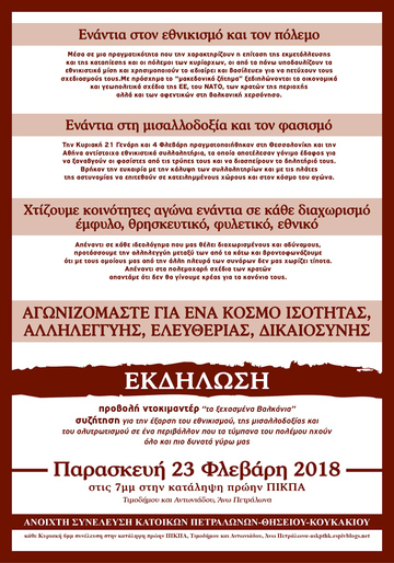 Μέσα σε μια πραγματικότητα που την χαρακτηρίζουν η επίταση της εκμετάλλευσης και της καταπίεσης και οι πόλεμοι των κυρίαρχων, οι από τα πάνω υποδαυλίζουν τα εθνικιστικά μίση και χρησιμοποιούν το «διαίρει και βασίλευε» για να πετύχουν τους σχεδιασμούς τους. Με πρόσχημα το "μακεδονικό ζήτημα" ξεδιπλώνονται τα οικονομικά και γεωπολιτικά σχέδια της ΕΕ, του ΝΑΤΟ, των κρατών της περιοχής αλλά και των αφεντικών στη βαλκανική χερσόνησο.