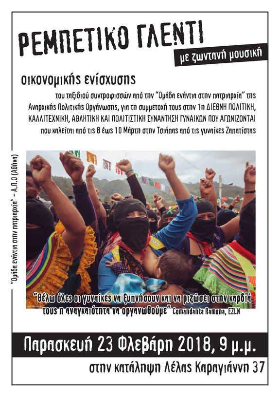 του ταξιδιού συντροφισσών από την "Ομάδα ενάντια στην πατριαρχία" της Αναρχικής Πολιτικής Οργάνωσης, για τη συμμετοχή τους στην 1η ΔΙΕΘΝΗ ΠΟΛΙΤΙΚΗ, ΚΑΛΛΙΤΕΧΝΙΚΗ, ΑΘΛΗΤΙΚΗ ΚΑΙ ΠΟΛΙΤΙΣΤΙΚΗ ΣΥΝΑΝΤΗΣΗ ΓΥΝΑΙΚΩΝ ΠΟΥ ΑΓΩΝΙΖΟΝΤΑΙ που καλείται από τις 8 έως 10 Μάρτη στην Τσιάπας από τις γυναίκες Ζαπατίστας