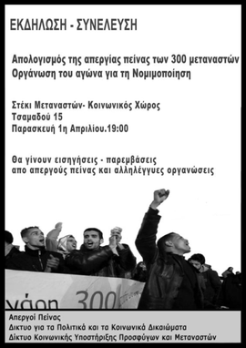 Το Δίκτυο Κοινωνικής Υποστήριξης Προσφύγων και Μεταναστών, το Δίκτυο για τα Πολιτικά και Κοινωνικά Δικαιώματα και μετανάστες πρώην Απεργοί Πείνας διοργανώνουν εκδήλωση-συνέλευση απολογισμού του μεγάλου μεταναστευτικού κινήματος των 300 και οργάνωσης των επόμενων βημάτων στον αγώνα για τη νομιμοποίηση των μεταναστών και μεταναστριών.