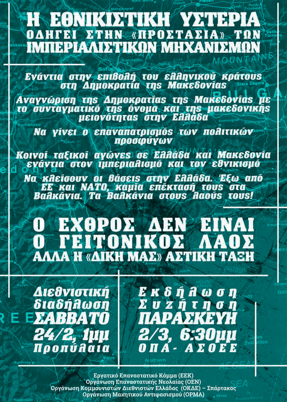 Ο εχθρός μας δεν είναι ο μακεδονικός λαός ή οι άλλοι λαοί της περιοχής μας, αλλά η αστική «μας» τάξη, οι κυβερνήσεις «μας» και οι ιμπεριαλιστές σύμμαχοί τους. Η διεθνιστική απάντηση είναι η μοναδική διέξοδος που μπορεί να οικοδομήσει ένα ταξικό κίνημα που θα παλέψει για μια ειρηνική συμβίωση των λαών στα Βαλκάνια και την πλήρη αποχώρηση από τους ιμπεριαλιστικούς μηχανισμού του ΝΑΤΟ και της ΕΕ.
