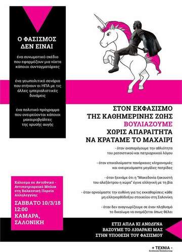 Η Αναρχοσυνδικαλιστική Πρωτοβουλία Ροσινάντε,καλεί στην πορεία που θα πραγματοποιηθεί το Σάββατο στις 10/3 στην πολη της Θεσσαλονίκης.