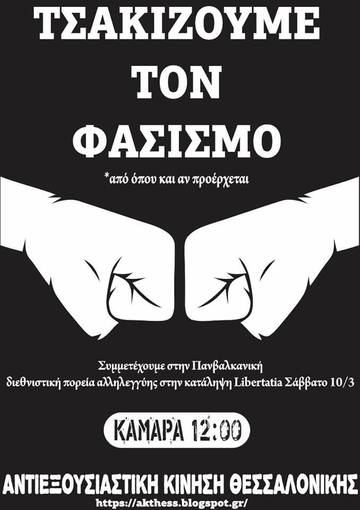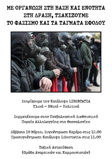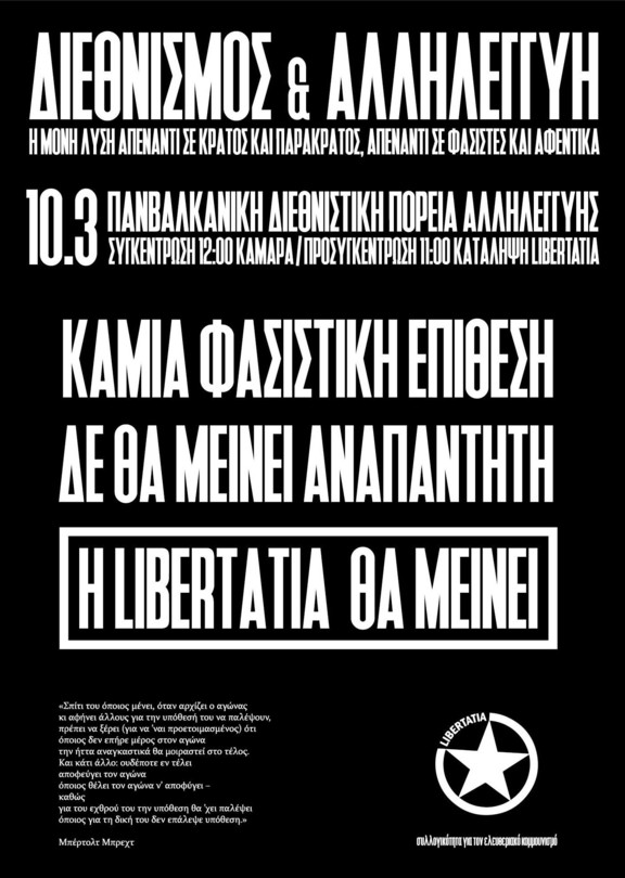 Για την πορεία στις 10/3Καλούμε τον κόσμο του κινήματος να στηρίξει την πανβαλκανική διεθνιστική πορεία αλληλεγγύης στην κατάληψη Libertatia, με τα προτάγματα της διεθνιστικής αλληλεγγύης και της υπεράσπισης των καταλήψεων και των δομών του αγώνα. Σε συνέχιση της αντανακλαστικής πορείας για τον εμπρησμό της κατάληψης μας στις 22/3 και των δράσεων αλληλεγγύης σε όλο τον ελλαδικό χώρο και σε άλλες χώρες, καλούμε συντρόφους και συντρόφισσες από την Ελλάδα και τα Βαλκάνια στις 10/3 στην Θεσσαλονίκη για να δοθεί μια μαζική απάντηση στον εθνικιστικό παροξυσμό και τις φασιστικές επιθέσεις. Καμία φασιστική επίθεση να μην μείνει αναπάντητη. Η Libertatia θα μείνει!