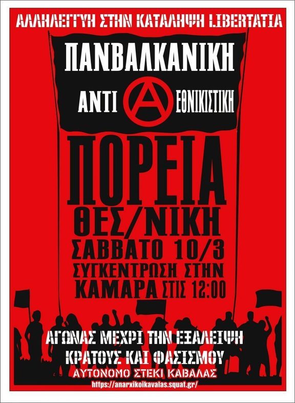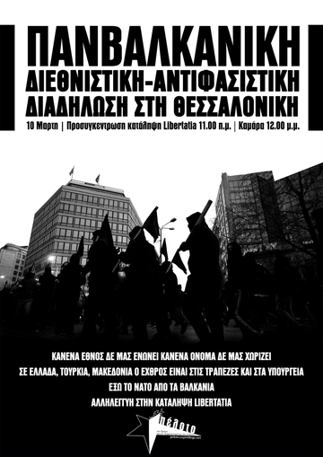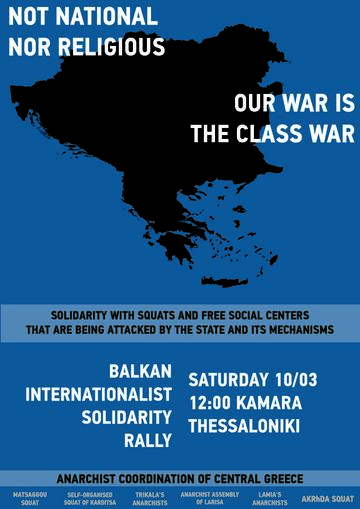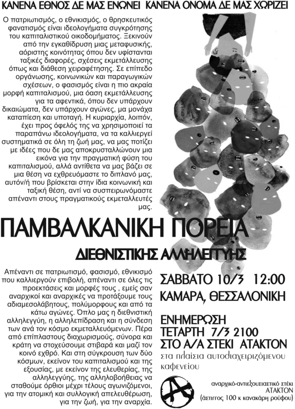 ές από τις πτυχές της επίθεσης που έχουν εξαπολύσει κράτος και κεφάλαιο εναντίον μας. Και η μόνη πραγματική αντίσταση είναι η ταξική-αντικρατική-διεθνιστική.» Και αυτό ακριβώς θα κάνουμε στις 10 του Μάρτη. Δίπλα-δίπλα με συντρόφους και συντρόφισσες από άλλες βαλκανικές -κι όχι μόνο- χώρες θα αναδείξουμε ότι υπάρχουν άνθρωποι που αντιστέκονται στον παραλογισμό του πολέμου, του μίσους και του εθνικισμού, άνθρωποι που βλέπουν τους πραγματικούς εχθρούς απ' όλες τις πλευρές των συνόρων, που δεν είναι άλλοι από το κράτος και το κεφάλαιο, μαζί με τις εφεδρείες