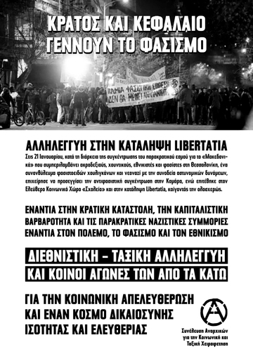 Να προσθέσουμε, τέλος, σχετικά με τον εμπρησμό της κατάληψης Libertatia στις 21 Γενάρη ότι, εδώ και δεκαετίες σημειώνονται φασιστικές επιθέσεις σε κατειλημμένους χώρους αγώνα, ορισμένοι εκ των οποίων κάηκαν ολοσχερώς εξαιτίας τέτοιων επιθέσεων. Καμιά όμως φασιστική επίθεση δεν έμεινε αναπάντητη και όλοι οι χώροι με την αμέριστη πολιτική, ηθική και υλική στήριξη των αλληλέγγυων, αποκαταστάθηκαν πλήρως και έμειναν (χωρίς διάφορες μεμψιμοιρίες που στοχεύουν στην απομείωση της συνεισφοράς τους και των πολιτικών επιλογών τους, και στη συγκεκριμένη περίπτωση της θαρραλέας Διεθνιστικής Αντιφασιστικής Συγκέντρωσης στην Καμάρα απέναντι στο εθνικιστικό συλλαλητήριο της Θεσσαλονίκης). Αυτό οφείλεται να γίνει με την Καταληψη Libertatia και αυτό θα γίνει.-