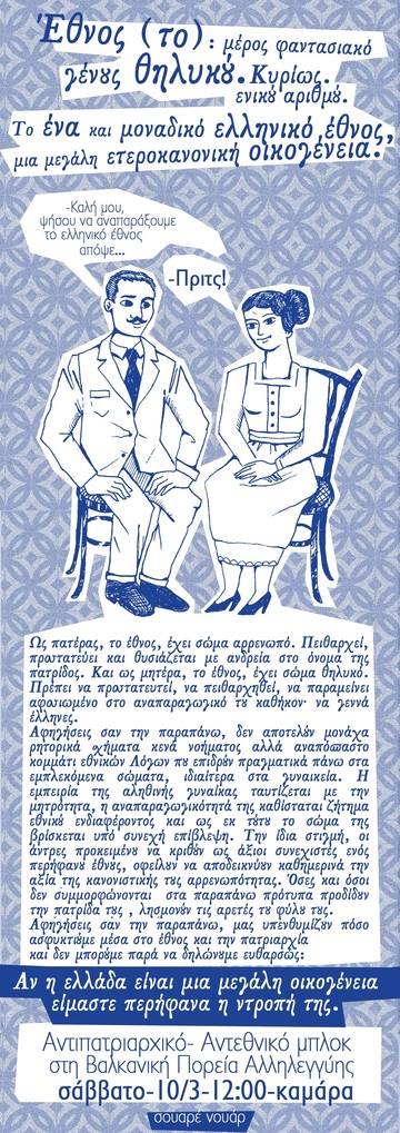 Ο εθνικιστικός και φασιστικός ολοκληρωτισμός συνίστανται μεταξύ άλλων στην άρνηση οποιασδήποτε άλλης ταυτότητας πέραν της εθνικής. Σε αυτό το πλαίσιο, το να είσαι γυναίκα και να αγωνίζεσαι για την ανατροπή της υπάρχουσας κατάστασης πραγμάτων συνιστά ένα διπλό «έγκλημα»: το «έγκλημα» παραβίασης της «γυναικείας φύσης» η οποία προορίζει τη γυναίκα για το ρόλο της μητέρας που τροφοδοτεί τις δυνάμεις του έθνους και το «έγκλημα» αμφισβήτησης της «εθνικής ενότητας» μέσω της ανάδειξης των ανταγωνιστικών συμφερόντων κυρίαρχων και κυριαρχούμενων, εκμεταλλευτών και εκμεταλλευόμενων. Από αυτή την άποψη, δεν είναι τυχαία η «ειδική μεταχείριση» που επιφυλάσσουν οι δυνάμεις καταστολής στις αγωνιζόμενες γυναίκες, με χαρακτηριστικά παραδείγματα τον βασανισμό των συλληφθεισών της αντιφασιστικής μοτοπορείας στον Αγ. Παντελεήμονα το 2012 καθώς και την στοχευμένη επίθεση σε συντρόφισσά μας που συμμετείχε στην αντιφασιστική διαδήλωση της στη Θεσσαλονίκη το περασμένο καλοκαίρι.