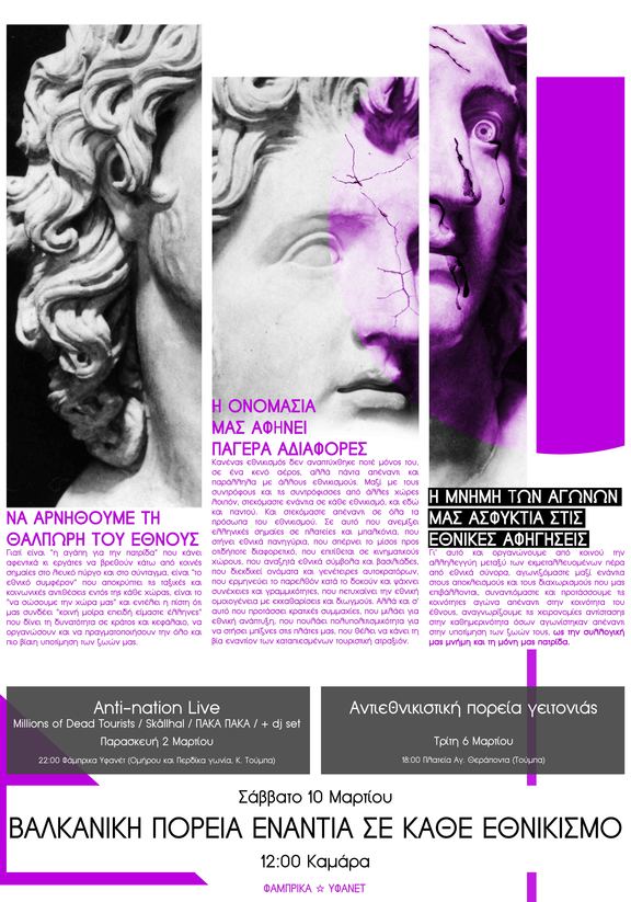 Κανένας εθνικισμός δεν αναπτύχθηκε ποτέ μόνος του, σε ένα κενό αέρος, αλλά πάντα απέναντι και παράλληλα με άλλους εθνικισμούς. Μαζί με τους συντρόφους και τις συντρόφισσες από άλλες χώρες λοιπόν, στεκόμαστε ενάντια σε κάθε εθνικισμό, και εδώ και παντού. Και στεκόμαστε απέναντι σε όλα τα πρόσωπα του εθνικισμού. Σε αυτό που ανεμίζει ελληνικές σημαίες σε πλατείες και μπαλκόνια, που στήνει εθνικά πανηγύρια, που σπέρνει το μίσος προς οτιδήποτε διαφορετικό, που επιτίθεται σε κινηματικούς χώρους, που αναζητά εθνικά σύμβολα και βασιλιάδες, που διεκδικεί ονόματα και γενέτειρες αυτοκρατόρων, που ερμηνεύει το παρελθόν κατά το δοκούν και ψάχνει συνέχειες και γραμμικότητες, που πετυχαίνει την εθνική ομοιογένεια με εκκαθαρίσεις και διωγμούς. Αλλά και σ' αυτό που προτάσσει κρατικές συμμαχίες, που μιλάει για εθνική ανάπτυξη, που πουλάει πολυπολιτισμικότητα για να στήσει business στις πλάτες μας, που θέλει να κάνει τη βία εναντίον των καταπιεσμένων τουριστική ατραξιόν.