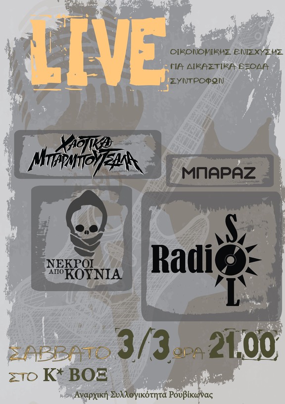 LIVE Οικονομικής ενίσχυσης για δικαστικά έξοδα συντρόφων το Σάββατο 3/3 στις 21:00 στο Κ*ΒΟΞ (Αραχώβης και Θεμιστοκλέους, πλατεία Εξαρχείων)