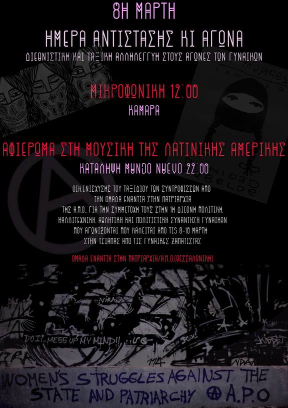 Οικ. ενίσχυσης του ταξιδιού των συντροφισσών από την "ομάδα ενάντια στην πατριαρχία" της Α.Π.Ο. στην ΠΡΩΤΗ ΔΙΕΘΝΗ, ΠΟΛΙΤΙΚΗ, ΚΑΛΛΙΤΕΧΝΙΚΗ, ΑΘΛΗΤΙΚΗ ΚΑΙ ΠΟΛΙΤΙΣΤΙΚΗ ΣΥΝΑΝΤΗΣΗ ΓΥΝΑΙΚΩΝ ΠΟΥ ΑΓΩΝΙΖΟΝΤΑΙ που καλείται από 8-10 Μάρτη στην Τσιάπας από τις γυναίκες Ζαπατίστας