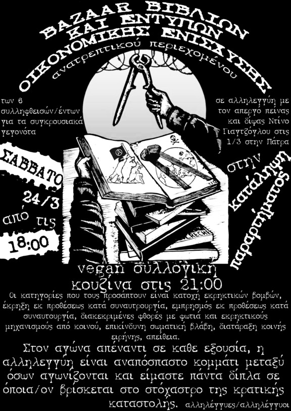 των 6 συλληφθεισών/έντων για τα συγκρουσιακά γεγονότα σε αλληλεγγύη με τον απεργό πείνας και δίψας Ντίνο Γιαγτζόγλου στις 1/3 στην Πάτρα.