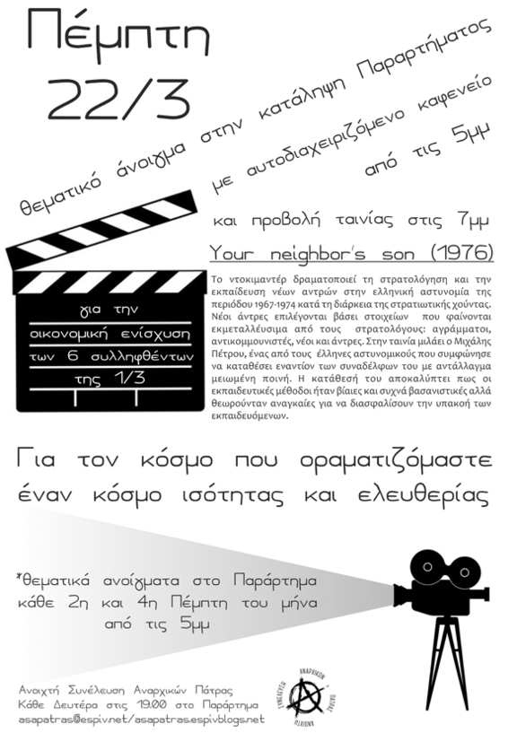 Aυτοδιαχειρiζόμενο καφενείο με προβολή ταινίας για την οικονομική ενίσχυση των 6 συλληφθέντων της 1/3 στην Πάτρα.