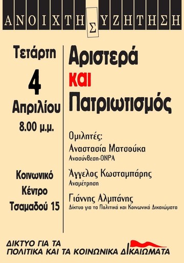 Την Τετάρτη 4 Απριλίου στις 8:00μμ στο Κοινωνικό Κέντρο Τσαμαδού 15, θα προσπαθήσουμε να πάμε λίγο παραπέρα αυτή τη συζήτηση. Εισηγητικές τοποθετήσεις θα κάνουν οι: Αναστασία Ματσούκα (Ανασύνθεση-ΟΝΡΑ), Άγγελος Κωσταμπάρης, (Αναμέτρηση), Γιάννης Αλμπάνης (Δίκτυο)