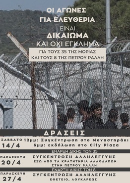 Με πρωτοβουλία του Συντονισμού συλλογικοτήτων και ατόμων ενάντια στα κέντρα κράτησης (ΣΣΑΕΚΚ) καλέστηκε ανοιχτή συνέλευση όπου συμφωνήθηκε το παρακάτω πλάνο δράσεων σχετικά με τις υποθέσεις των 8 και των 35 διωκόμενων μεταναστών από Πέτρου Ράλλη και Μόρια