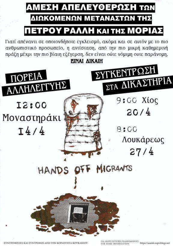 Στις 27/4 εκδικάζεται στην Αθήνα η υπόθεση των 8 μεταναστών της Πέτρου Ράλλη οι οποίοι συνελήφθησαν στις 31 Μάη 2017 και τους απαγγέλθηκαν κατηγορίες μέσω στημένης δικογραφίας έπειτα από ξυλοδαρμό τους από ανθρωποφύλακες του μεταγωγών ως απάντηση σε διαμαρτυρία σχετικά με το αόριστο του χρόνου εγκλεισμού τους. Λίγες μέρες νωρίτερα, στις 20/4, εκδικάζεται στη Χίο η υπόθεση των 35 μεταναστών στη Μόρια της Μυτιλήνης, εκδικητικές συλλήψεις οι οποίες πραγματοποιήθηκαν στο σωρό και τους απαγγέλθηκαν κατηγορίες κακουργηματικού χαρακτήρα έπειτα από εξέγερση στο κέντρο κράτησης στις 18 Ιούλη του 2017, που αφορούσε ζητήματα ασύλου και τις άθλιες συνθήκες κράτησης τους.