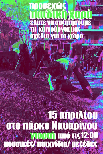 Ελάτε να συζητήσουμε μαζί τα νέα μας σχέδια την Κυριακή 15 Απριλίου στις 12:00, στο Αυτοδιαχειριζόμενο Πάρκο Ναυαρίνου με μουσική, ποτά, μεζέδες και δραστηριότητες για μικρά και μεγάλα παιδιά.