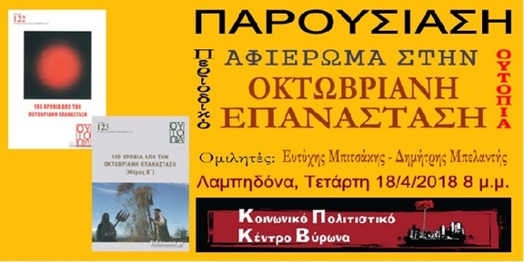 Το Κοινωνικό Πολιτιστικό Κέντρο Βύρωνα σας προσκαλεί στη συνέχεια του κύκλου συζητήσεων με άξονα την Οκτωβριανή Επανάσταση του 1917 στη Ρωσική Αυτοκρατορία με την παρουσίαση/συζήτηση του αφιερώματος του περιοδικού "Ουτοπία", την Τετάρτη 18/4/2018, 8 μ.μ. στη Λαμπηδόνα.