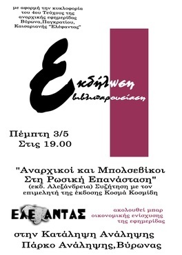 Παρουσίαση του βιβλίου ''Αναρχικοί και Μπολσεβίκοι στη Ρωσική Επανάσταση''(εκδ.Αλεξάνδρεια).Κατά τη διάρκεια της εκδήλωσης θα υπάρχει μπαρ οικονομικής ενίσχυσης της αναρχικής εφημερίδας δρόμου ''Ελέφαντας'' και bazaar βιβλίου των εκδόσεων ''Αλεξάνδρεια'' και κινηματικών εκδόσεων.