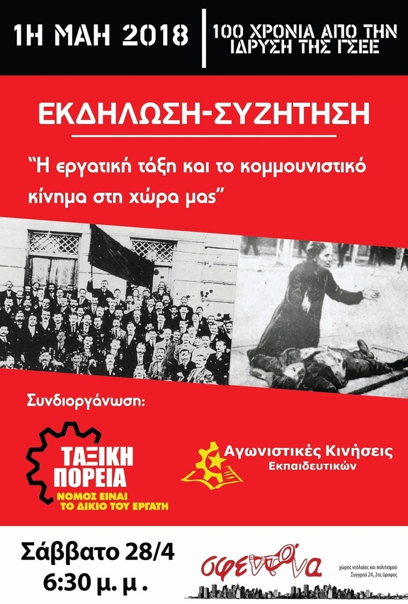 Με αφορμή την πρώτη Μάη και τα 100 χρόνια από την ίδρυση του ΣΕΚΕ - ΚΚΕ, η Ταξική Πορεία στη Θεσσαλονίκη μαζί με τις Αγωνιστικές Κινήσεις Εκπαιδευτικών διοργανώνουν πολιτική εκδήλωση - συζήτηση για την εργατική τάξη και το κομμουνιστικό κίνημα στη χώρα μας, την αλληλεπίδρασή τους, τις κρίσιμες καμπές και τις σημαντικές μάχες που δόθηκαν αλλά και την κατάσταση του εργατικού κινήματος σήμερα.