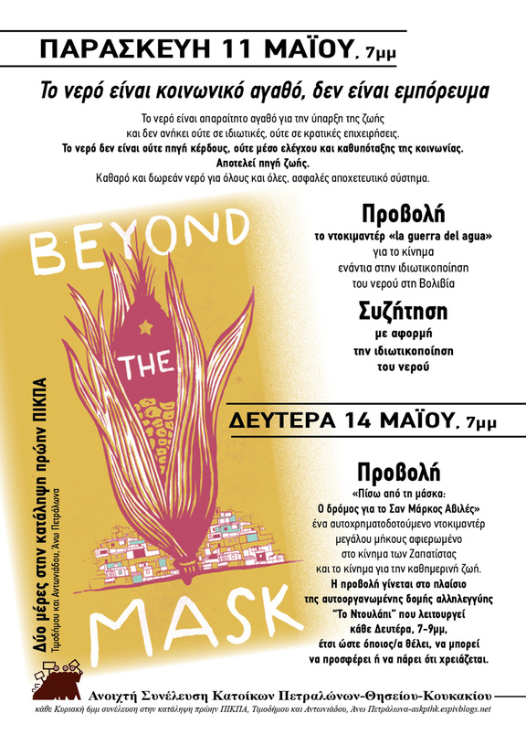 Προβολή «Πίσω από τη μάσκα: Ο δρόμος για το Σαν Μάρκος Αβιλές» ένα αυτοχρηματοδοτούμενο ντοκιμαντέρ μεγάλου μήκους αφιερωμένο στο κίνημα των Ζαπατίστας και το κίνημα για την καθημερινή ζωή. Η προβολή γίνεται στο πλαίσιο της αυτοοργανωμένης δομής αλληλεγγύης "Το Ντουλάπι" που λειτουργεί κάθε Δευτέρα, 7-9µµ, έτσι ώστε όποιος/α θέλει, να μπορεί να προσφέρει ή να πάρει ότι χρειάζεται.