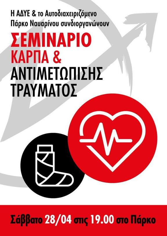 Ένα πολύτιμο σεμινάριο καρδιοαναπνευστικής αναζωογόνησης και αντιμετώπισης τραύματος, αυτό το Σάββατο στις 19:00 από την δραστήρια ΑΔΥΕ http://adye.espivblogs.net/ και το Αυτοδιαχειριζόμενο Πάρκο Ναυαρίνου.
