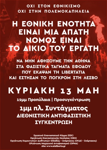 Την Κυριακή 13 του Μάη στη 1 το μεσημέρι, το κέντρο της Αθήνας θα ανήκει στο αντιφασιστικό, ταξικό κίνημα. Η Οργάνωση Μαχητικού Αντιφασισμού μαζί με το Ε.Ε.Κ., την Ο.Κ.Δ.Ε. (Σπάρτακος), την Ο.Ε.Ν. και το elaliberta.gr καλεί τις δυνάμεις της εργασίας και της νεολαίας να σταματήσουν για άλλη μια φορά την προσπάθεια νομιμοποίησησης των δολοφόνων των Σ. Λουκμάν και Π. Φύσσα.