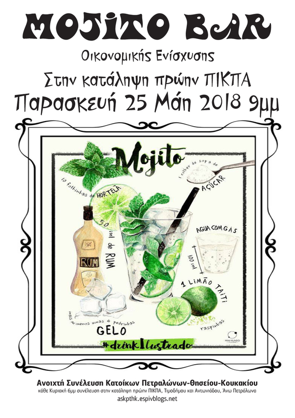 Την Παρασκευή 25 Μαΐου 2018, από τις 9μμ, σας περιμένουμε στην αυλή της κατάληψης πρώην ΠΙΚΠΑ στα Άνω Πετράλωνα στο mojito bar, που διοργανώνει η Ανοιχτή Συνέλευση Κατοίκων Πετραλώνων-Θησείου-Κουκακίου. Τα έσοδα θα διατεθούν για την οικονομική στήριξη των δραστηριοτήτων της συνέλευσης.
