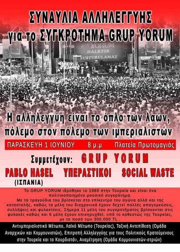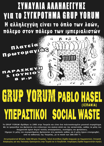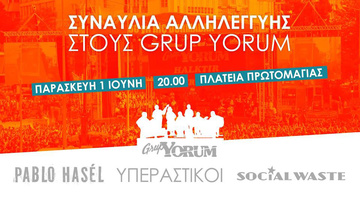 Την 1η Ιουνίου θα πραγματοποιηθεί συναυλία αλληλεγγύης του μουσικού συγκροτήματος GRUP YORUM στην Πλατεία Πρωτομαγιάς με συμμετοχή συγκροτημάτων και μουσικών: GRUP YORUM, PABLO HASEL, ΥΠΕΡΑΣΤΙΚΟΙ, SOCIAL WASTE…
