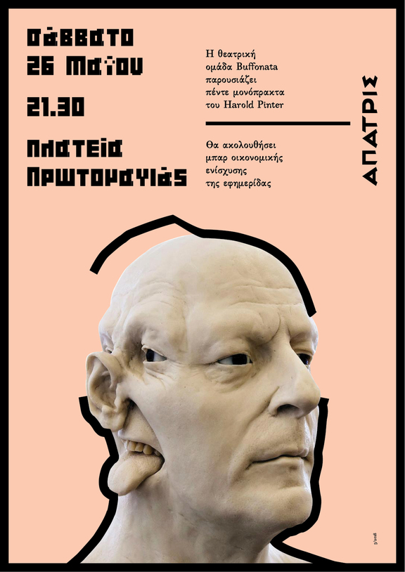 Το Σάββατο 26 Μαΐου, στις 21:30, στην πλατεία Πρωτομαγιάς, η θεατρική ομάδα Buffonata παρουσιάζει πέντε μονόπρακτα του Harold Pinter και μετά το τέλος της παράστασης θα ακολουθήσει bar οικονομικής ενίσχυσης της εφημερίδας δρόμου Άπατρις.