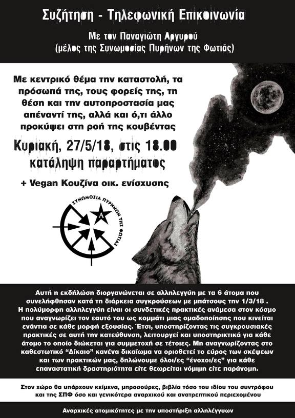 Συζήτηση - Τηλεφωνική επικοινωνία με τον έγκλειστο σύντροφο Π. Αργυρού με κεντρικό θέμα την καταστολή, τα πρόσωπά της, τους φορείς της, τη θέση και την αυτοπροστασία μας απέναντί της, αλλά και ό,τι άλλο προκύψει στη ροή της κουβέντας