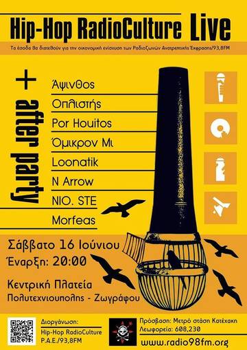 Η εκπομπή Χιπ-Χοπ Ραδιοκουλτούρα και οι 93.8fm - Ραδιοζώνες ανατρεπτικής Έκφρασης σας προσκαλούν στη συναυλία που διοργανώνουν με αφορμή τα 16 χρόνια λειτουργίας του σταθμού.