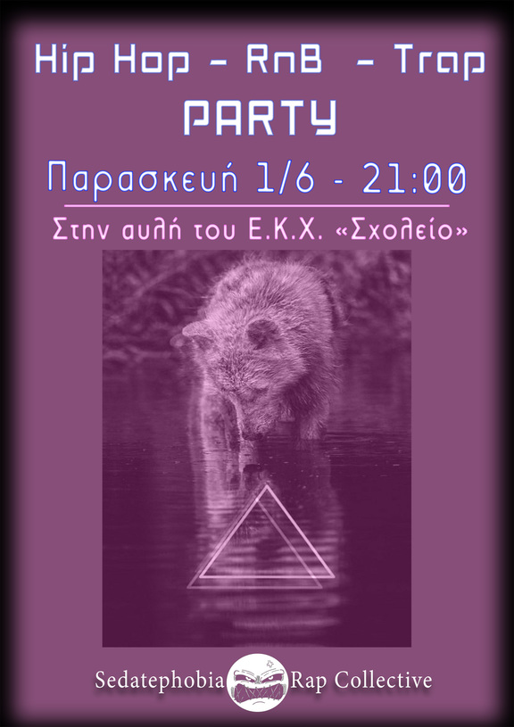 Bar στην αυλή του Ελεύθερου Κοινωνικού Χώρου "ΣΧΟΛΕΙΟ" από την αυτοοργανωμένη Rap συλλογικότητα "Sedatephobia".Τα έσοδα θα διατεθούν για την οικονομική ενίσχυση της ομάδας. Μουσικές επιλογές από τους Σαρδάμ, Άγρι, ΚουΛού σε R&B, Trap και Rap ρυθμούς!!!