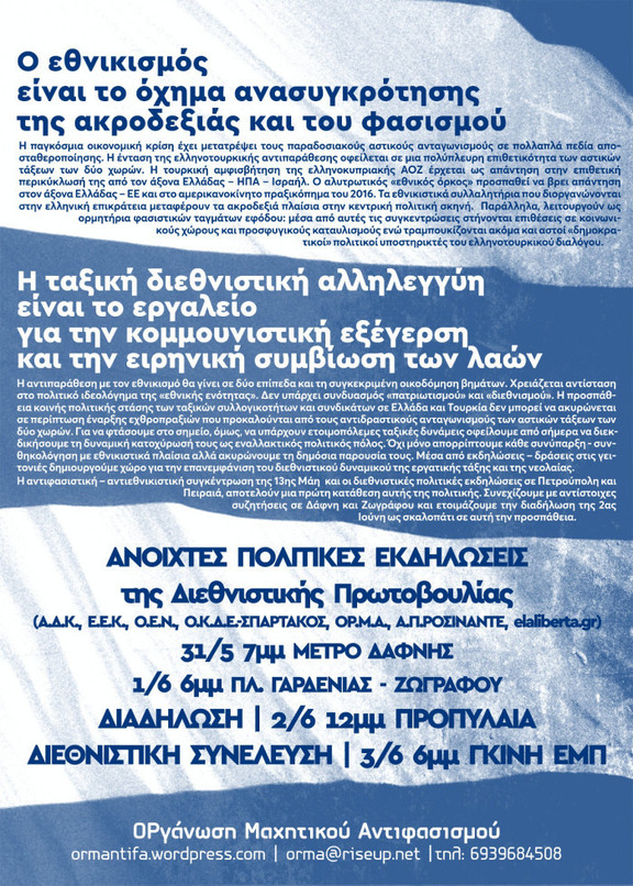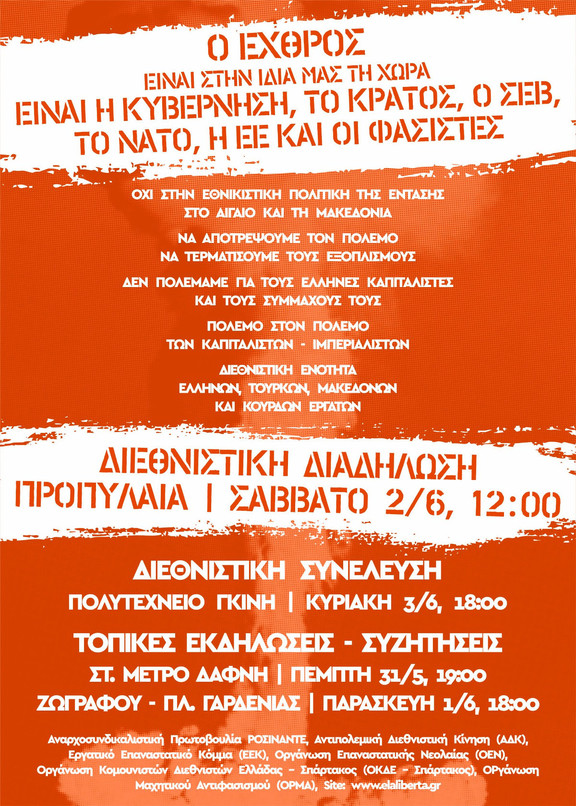 Η αντιφασιστική - αντιεθνικιστική συγκέντρωση της 13ης Μάη και οι διεθνιστικές πολιτικές εκδηλώσεις σε Πετρούπολη (12/5) και Πειραιά (18/5), αποτελούν μια πρώτη κατάθεση αυτής της πολιτικής. Συνεχίζουμε με αντίστοιχες συζητήσεις σε Δάφνη και Ζωγράφου και ετοιμάζουμε την διαδήλωση της 2ας Ιούνη ως σκαλοπάτι σε αυτή την προσπάθεια.