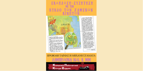 Το Κοινωνικό - Πολιτιστικό Κέντρο Βύρωνα σας προσκαλεί στην εκδήλωση - συζήτηση με τον Κύκλο των Χαμένων Κινητών που θα πραγματοποιηθεί την Πέμπτη 14/6/2018, 8 μ.μ. στη Λαμπηδόνα.