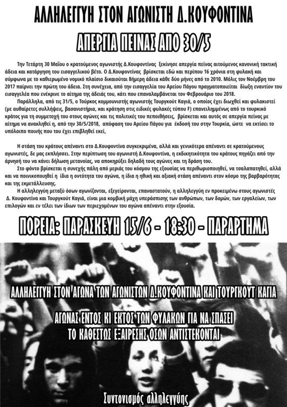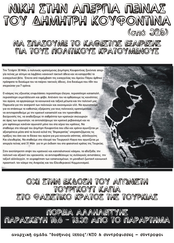 Για την πορεία της Παρασκευής 15/6, σε αλληλεγγύη με τους αγωνιστές Δ. Κουφοντίνα και Τουργκούτ Καγιά.