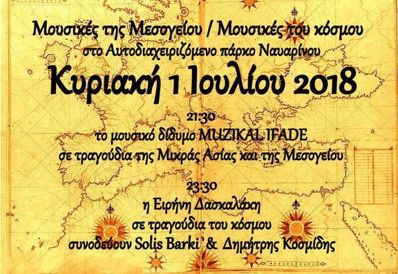 Ώρα 23:30 Τραγούδια του κόσμου με την Ειρήνη Δασκαλάκη (τραγούδι-κιθάρα). Συνοδεύουν Solis Barki (κρουστά), Δημήτρης Κοσμίδης (μπουζούκι).