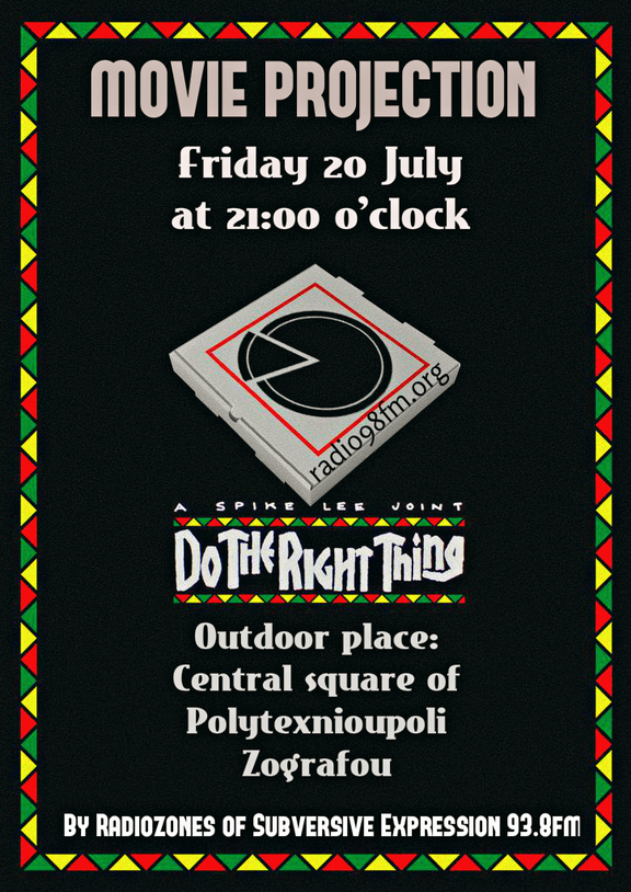 Την Παρασκευή 20 Ιουλίου στις 21:00, θα προβληθεί η ταινία "Do the Right Thing" (1989), στην κεντρική πλατεία της πολυτεχνειούπολης Ζωγράφου.