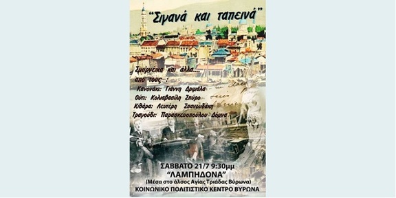 Το Κοινωνικό - Πολιτιστικό Κέντρο Βύρωνα σας προσκαλεί στην μουσική βραδιά με τίτλο "Σιγανά και Ταπεινά" που θα πραγματοποιηθεί το Σάββατο 21/7/2018, 9:30 μ.μ. στη Λαμπηδόνα. Είσοδος ελεύθερη.