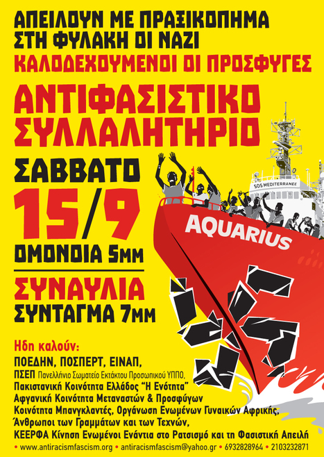 Για να βροντοφωνάξουμε με χιλιάδες αγωνιστές και αγωνίστριες, αντιφασιστικές αντιρατσιστικές κινήσεις και συλλογικότητες, σωματεία και συλλόγους: Στη φυλακή οι φασίστες-ανοιχτά σύνορα για τους πρόσφυγες/μετανάστες.
