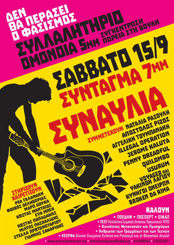 Καλούμε όλους και όλες σε ένα μεγάλο αντιφασιστικό συλλαλητήριο και συναυλία στο Σύνταγμα, μπροστά στη Βουλή, το Σάββατο 15 Σεπτέμβρη.