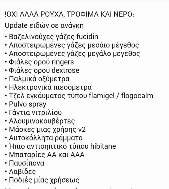 Η αυλή θα είναι ανοιχτή από τις 8μμ και μετά για όποιον/όποια θέλει να αφήσει επιπλέον είδη ανάγκης. Παραθέτουμε την πιο πρόσφατη λίστα με τα πράγματα που χρειάζονται οι πυροπαθείς: