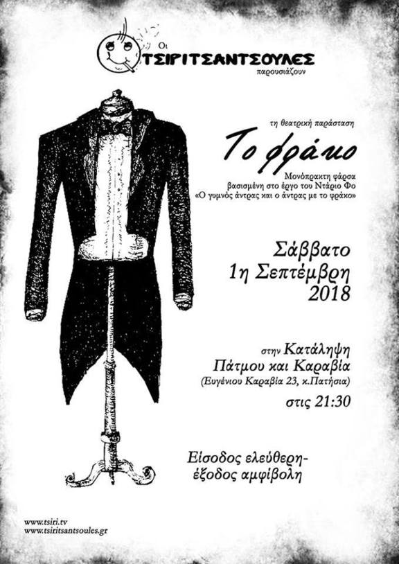 Η νέα θεατρική υπερπαραγωγή "Το φράκο" από τις Τσιριτσάντσουλες για μία παράσταση στην Κατάληψη Πάτμου και Καραβία (Ευγένιου Καραβία 23, κ.Πατήσια).
